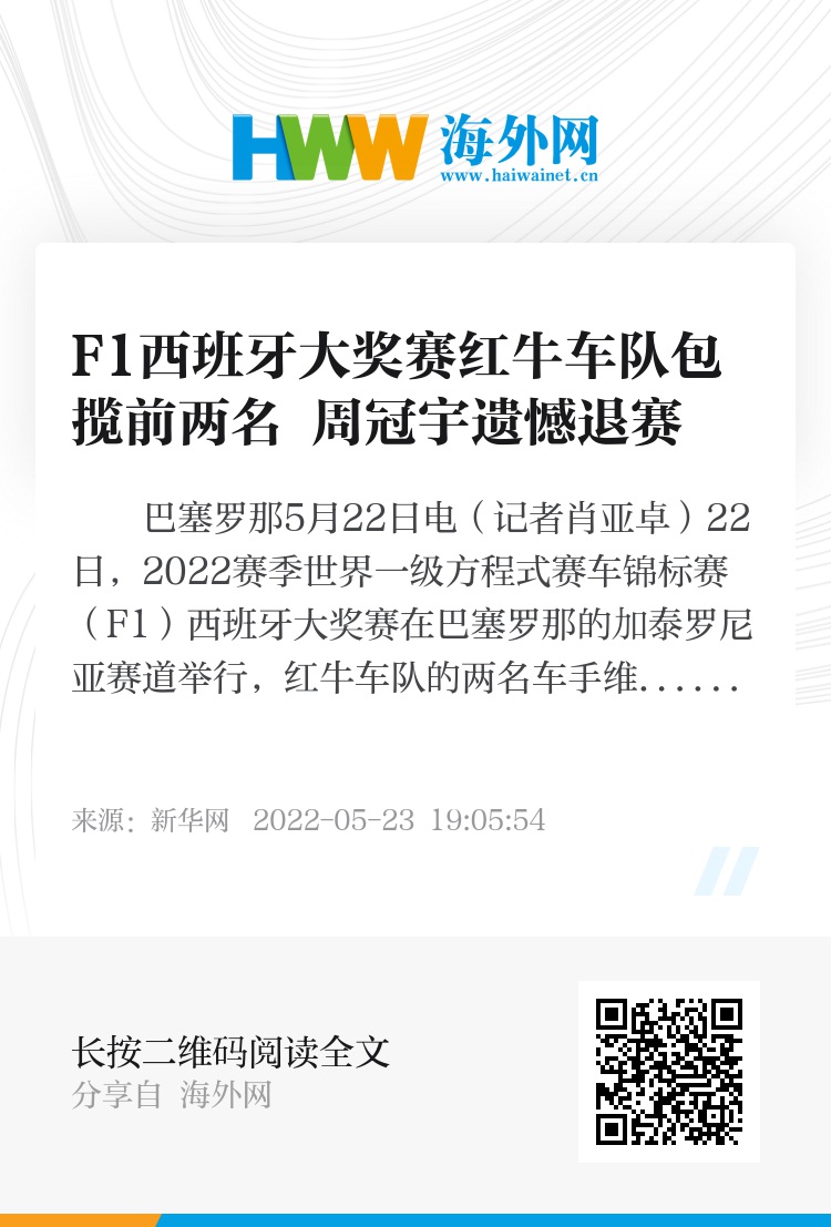 新华社巴塞罗那5月22日电(记者肖亚卓)22日,2022赛季世界一级方程式赛车锦标赛(F1)西班牙大奖赛在巴塞罗那的加泰罗尼亚赛道举行,红牛车队的两名车手维斯塔潘和佩雷兹包揽了前两名,去年车手总冠军维斯塔潘也凭借本场比赛的胜利在积分榜上反超法拉利车队的勒克莱尔,暂时登上积分榜首位。