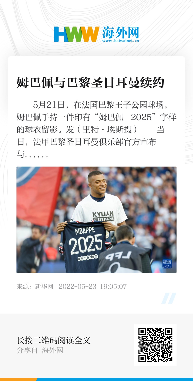 当日,法甲巴黎圣日耳曼俱乐部官方宣布与姆巴佩续约至2025年,并在主场与梅斯队的比赛前举行仪式。