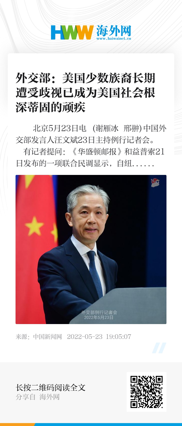 汪文斌:美国少数族裔长期遭受普遍性、系统性歧视,这已经成为美国社会根深蒂固的顽疾。包括非洲裔、原住民、拉丁裔、亚裔、穆斯林等在内的各少数族裔深受种族歧视之害,长期处于被剥夺和被损害的悲惨境地。
