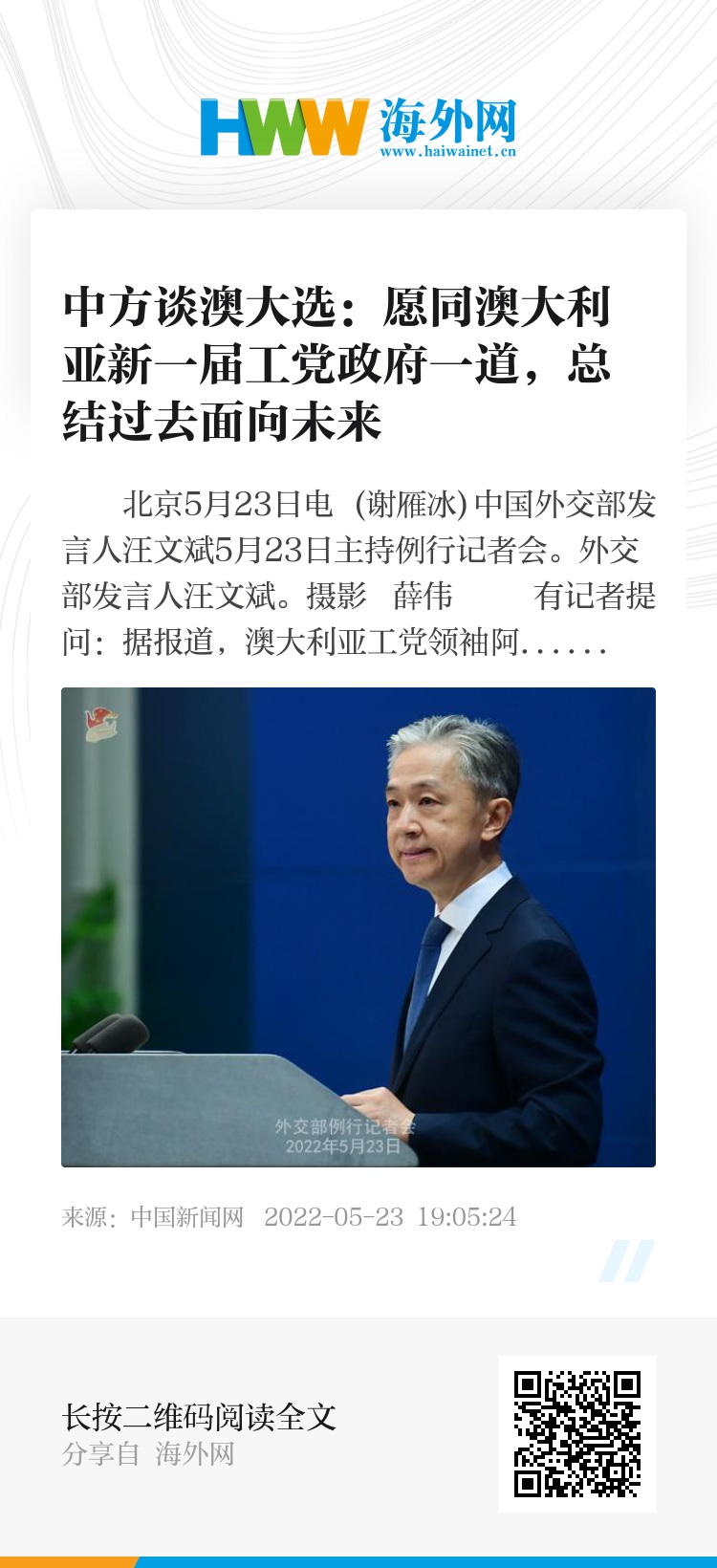 汪文斌:我们注意到,阿尔巴尼斯先生领导澳大利亚工党赢得澳大利亚联邦大选。中方对此表示祝贺。
