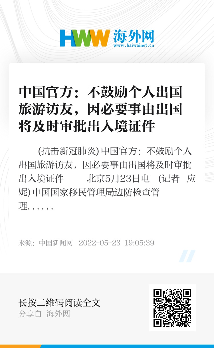 (抗击新冠肺炎)中国官方:不鼓励个人出国旅游访友,因必要事由出国将及时审批出入境证件