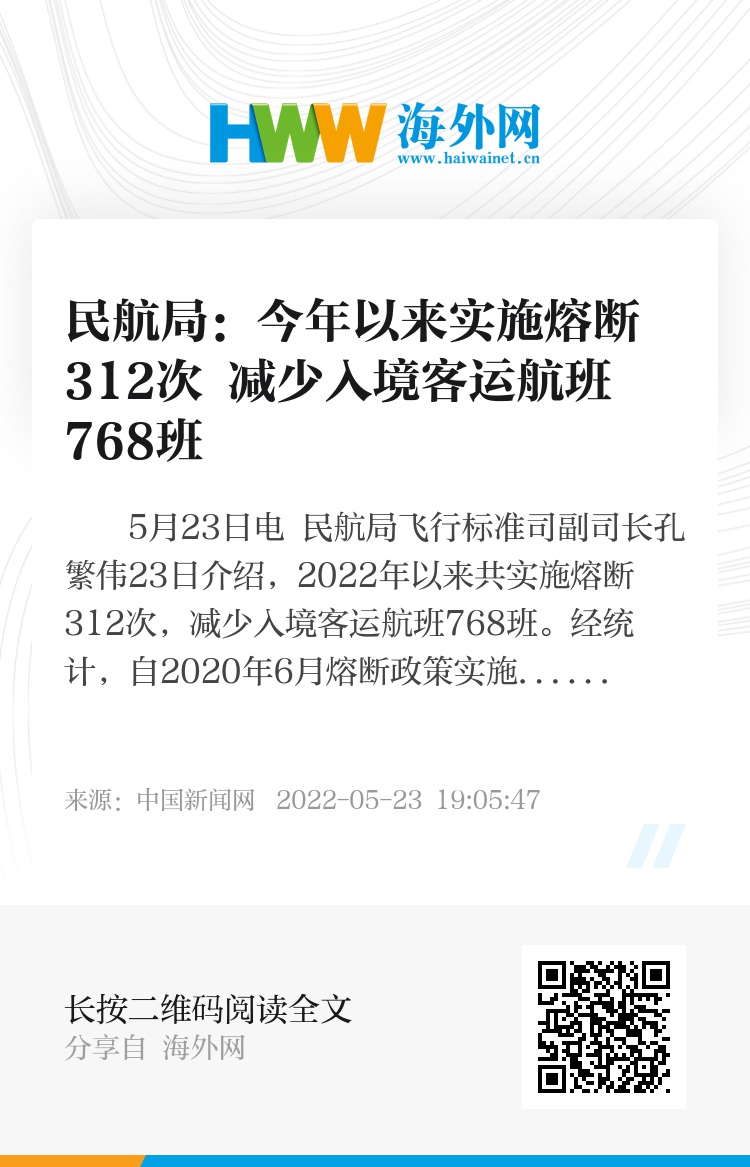 中新网5月23日电 民航局飞行标准司副司长孔繁伟23日介绍,2022年以来共实施熔断312次,减少入境客运航班768班。经统计,自2020年6月熔断政策实施以来,已累计执行熔断727次,减少入境客运航班1679班。