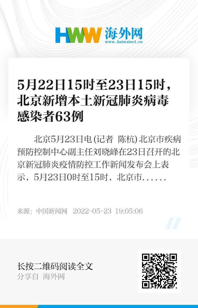 感染者1660:通过社会面核酸筛查发现,现住海淀区花园路街道北三环中路43号院。自述5月22日出现发热等症状,当日报告核酸检测结果为阳性,诊断为确诊病例,临床分型为轻型。