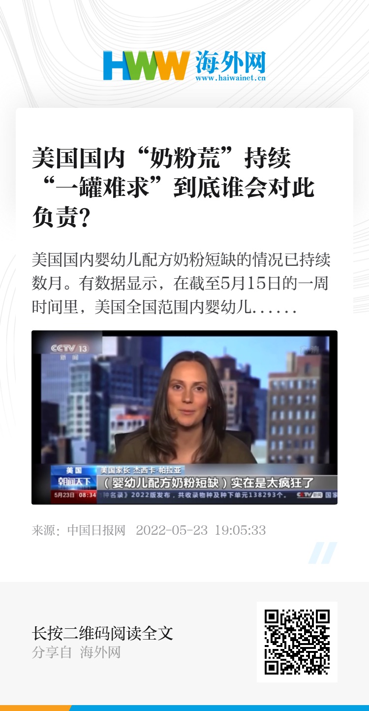 美国广播公司高级记者 特里·莫兰:婴幼儿配方奶粉严重短缺令美国人震惊,太令人震惊了,这样的政治后果是十分严重的。很难想象,在我们国家有那么多婴儿有死亡的风险 ,美国总统办公室对此负有责任。