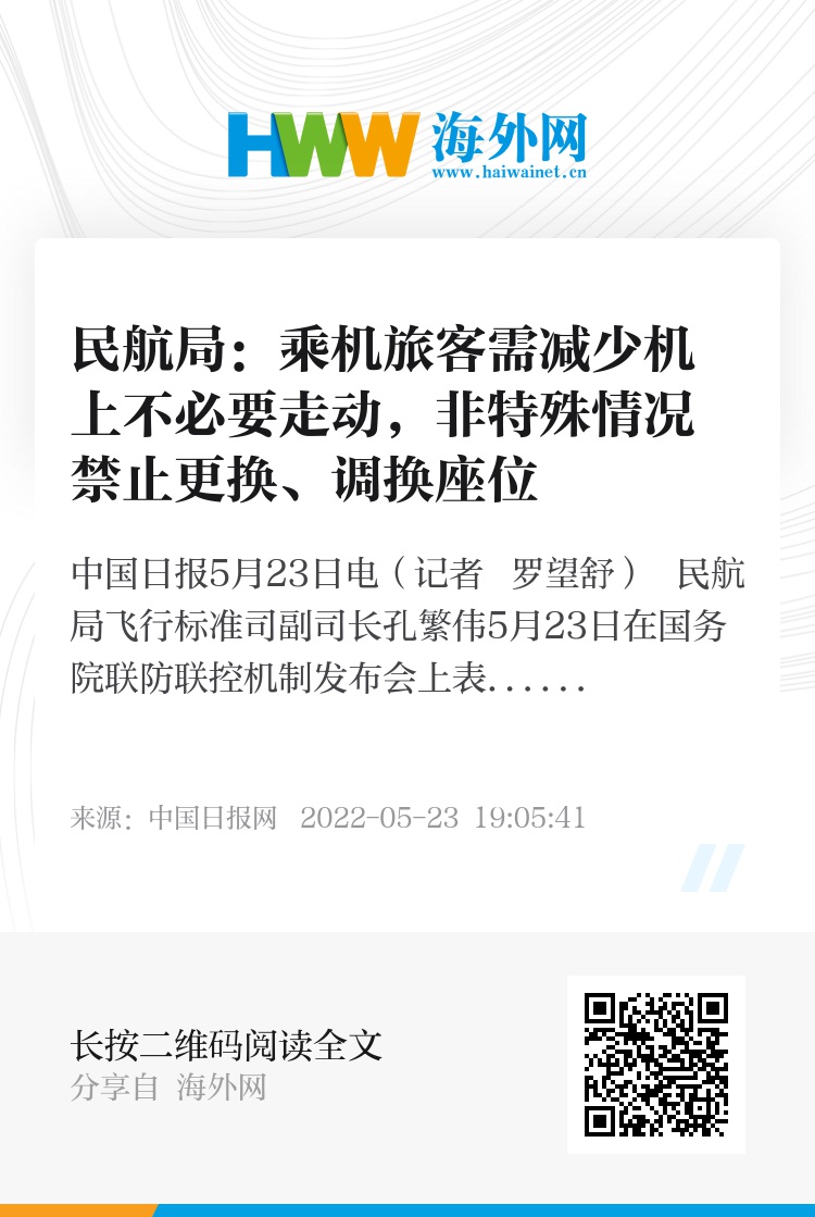 中国日报5月23日电(记者 罗望舒) 民航局飞行标准司副司长孔繁伟5月23日在国务院联防联控机制发布会上表示,为防止疫情经航空途径外溢和扩散,民航局全面严格落实机场区域从业人员分类管理;加密机场区域从业人员核酸检测频次;细化旅客运输过程中的防疫措施,注意在各个环节避免旅客聚集;并提醒旅客在配合做好登机前的手部消毒工作之外,还要自觉遵守乘机的各项防疫规定,全程规范佩戴口罩,飞机上要减少不必要走动,非特殊情况禁止更换、调换座位,避免因个人防护不到位造成暴露风险。