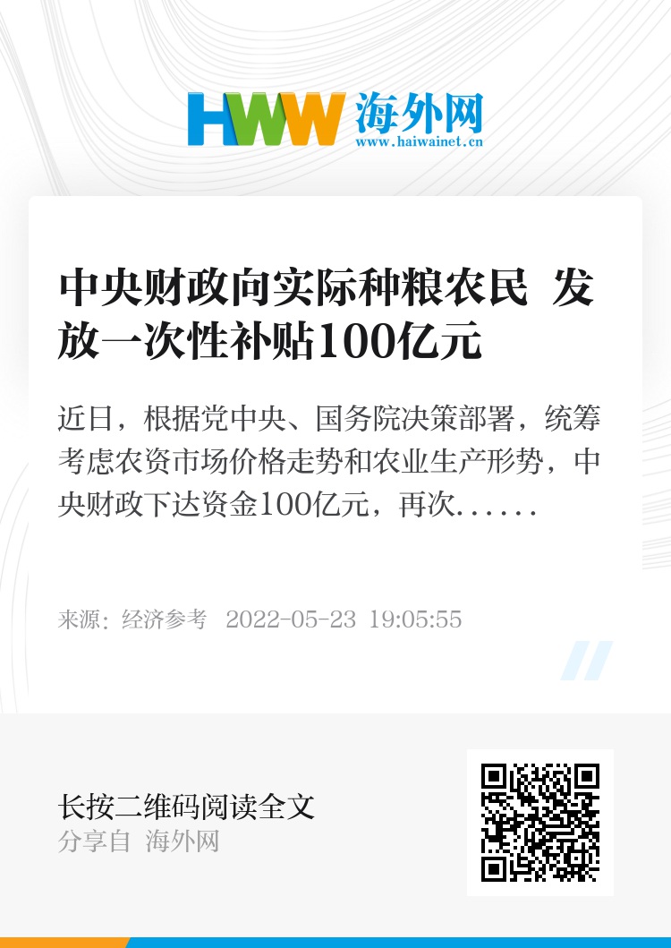 近日,根据党中央、国务院决策部署,统筹考虑农资市场价格走势和农业生产形势,中央财政下达资金100亿元,再次向实际种粮农民发放一次性农资补贴,支持夏收和秋播生产,缓解农资价格上涨带来的种粮增支影响,进一步调动农民种粮积极性。