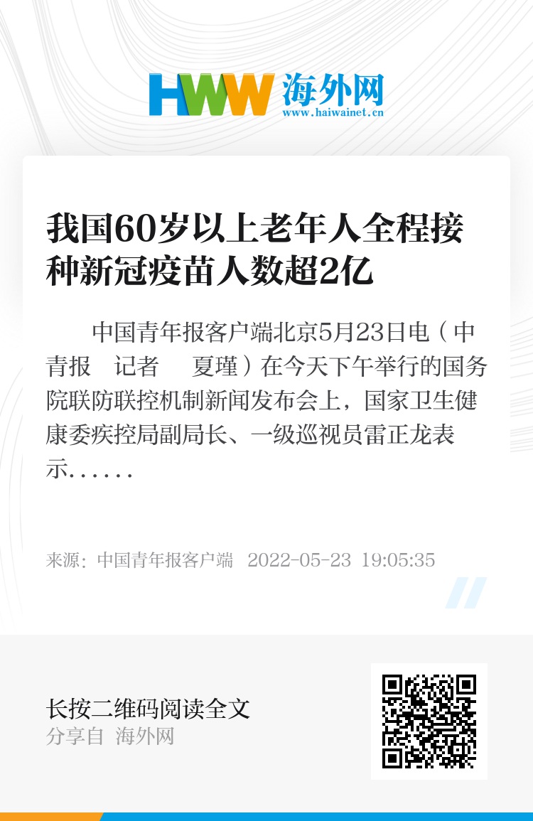 中国青年报客户端北京5月23日电(中青报・中青网记者 夏瑾)在今天下午举行的国务院联防联控机制新闻发布会上,国家卫生健康委疾控局副局长、一级巡视员雷正龙表示,截至5月22日,全国累计报告接种新冠疫苗33亿7109.6万剂次,接种总人数达到12亿8894.7万,已完成全程接种12亿5487.5万人,覆盖人数和全程接种人数分别占全国总人口的91.42%、88.01%。完成加强免疫接种的有7亿7138万人,其中序贯加强免疫接种3589.6万人。60岁以上老年人接种覆盖人数达到2亿2918.7万人,完成全程接种2亿1723.2万人,覆盖人数和全程接种人数分别占老年人口的86.8%、82.3%。完成加强免疫接种1亿6690万人。