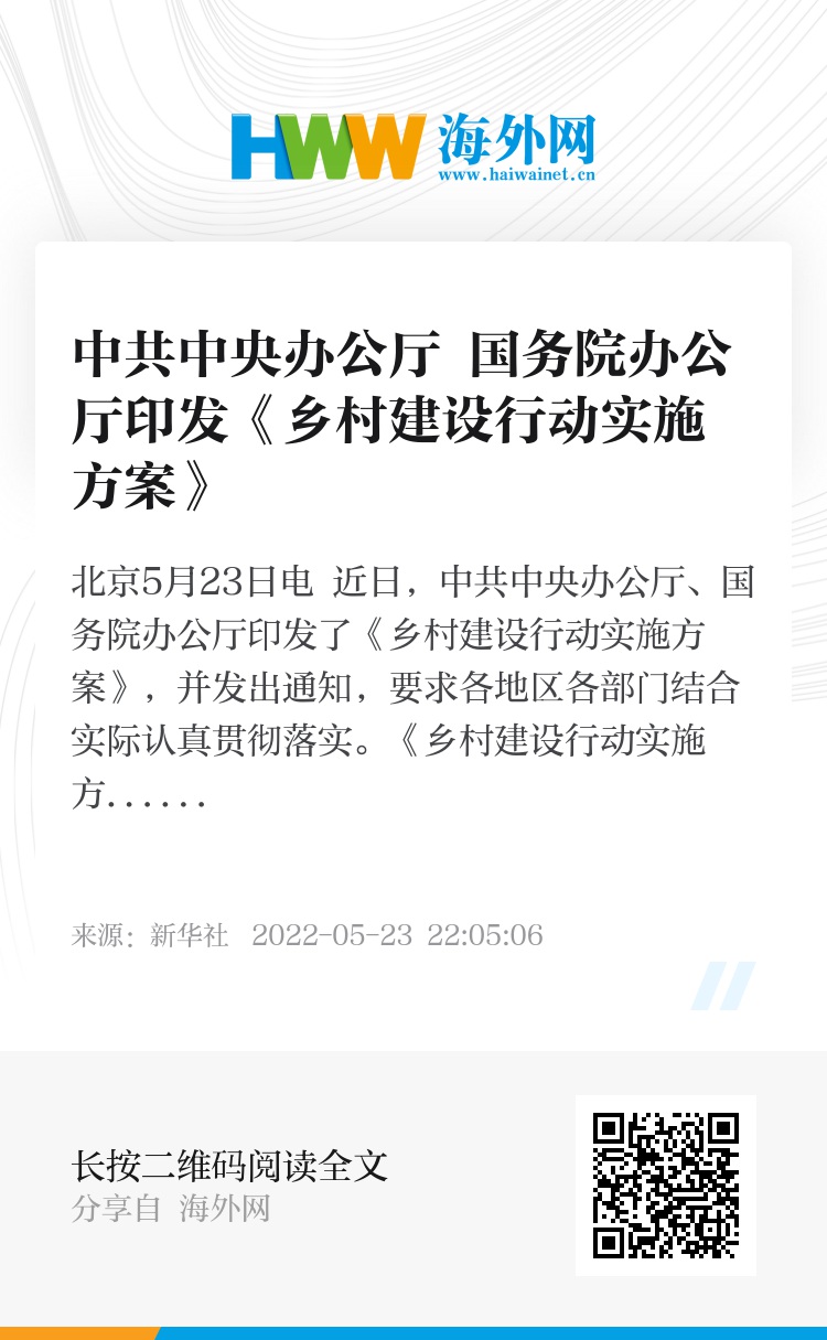 新华社北京5月23日电 近日,中共中央办公厅、国务院办公厅印发了《乡村建设行动实施方案》,并发出通知,要求各地区各部门结合实际认真贯彻落实。