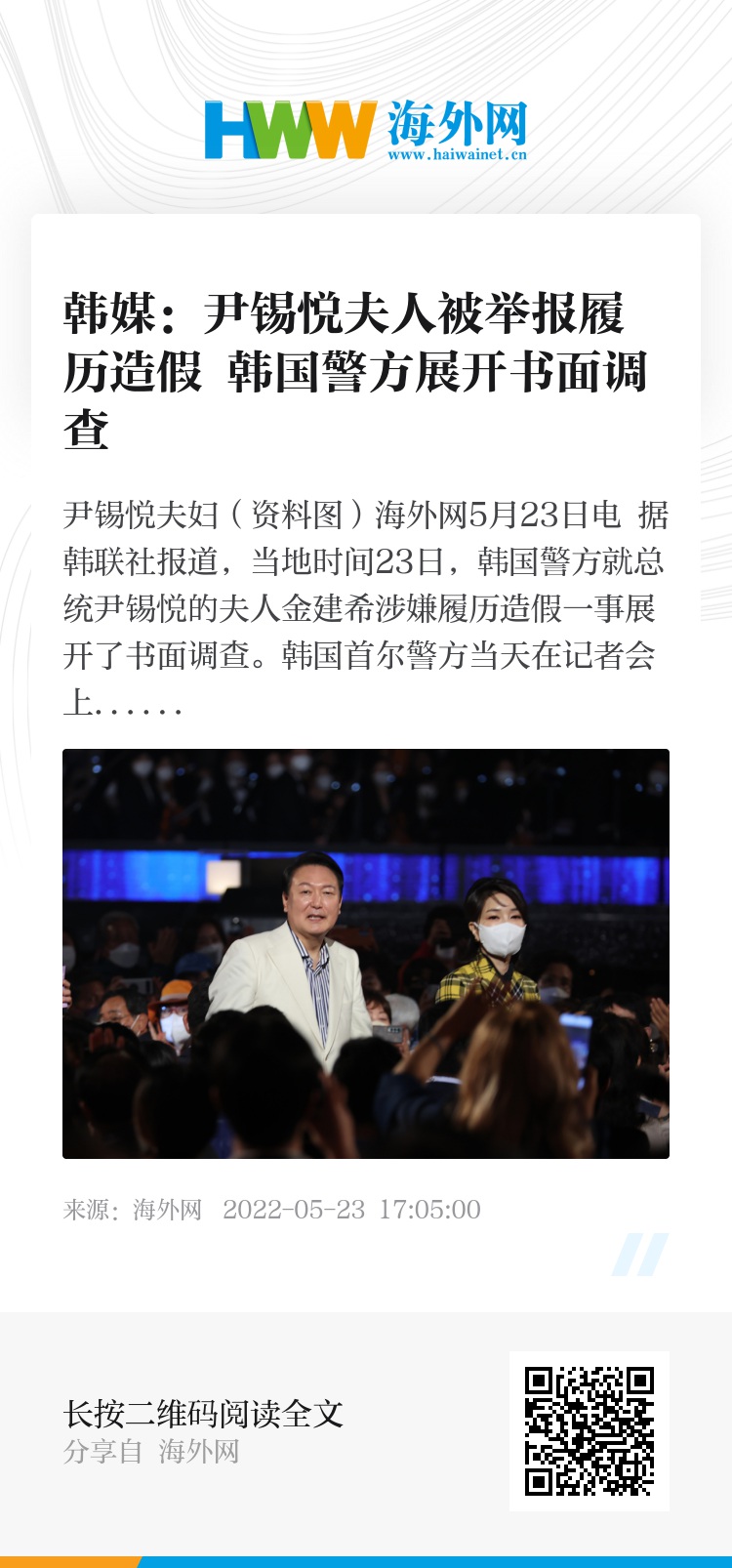 海外网5月23日电 据韩联社报道,当地时间23日,韩国警方就总统尹锡悦的夫人金建希涉嫌履历造假一事展开了书面调查。