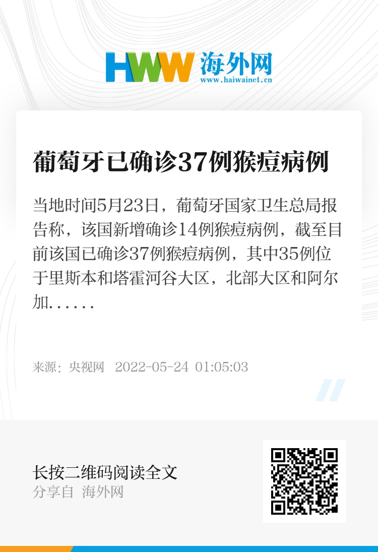 当地时间5月23日,葡萄牙国家卫生总局报告称,该国新增确诊14例猴痘病例,截至目前该国已确诊37例猴痘病例,其中35例位于里斯本和塔霍河谷大区,北部大区和阿尔加维大区各出现1例确诊病例,该国仍有更多疑似猴痘感染病例在等待检测结果。