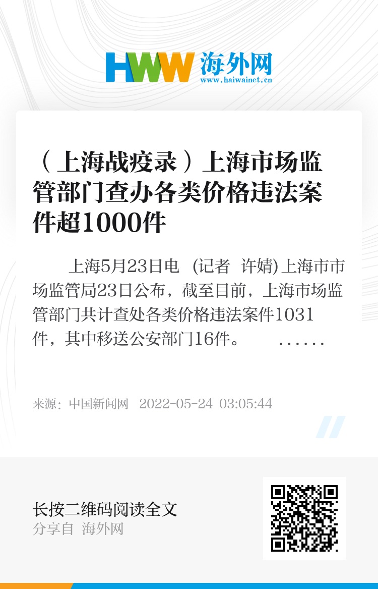 本轮疫情以来,全市市场监管部门围绕市民关注的价格问题,持续加强民生类商品和社区团购等重点领域价格监管,严厉打击“借疫生财”等扰乱市场秩序行为,从严从重从快查处各类价格违法案件,有力维护了市场价格平稳、秩序良好。(完)