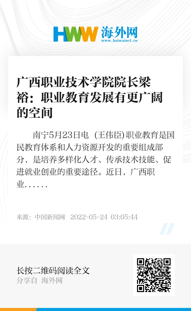 中新网南宁5月23日电 (王伟臣)职业教育是国民教育体系和人力资源开发的重要组成部分,是培养多样化人才、传承技术技能、促进就业创业的重要途径。近日,广西职业技术学院院长梁裕在接受采访时表示,职业教育在解决国内及国际产能需求等问题中大有可为。