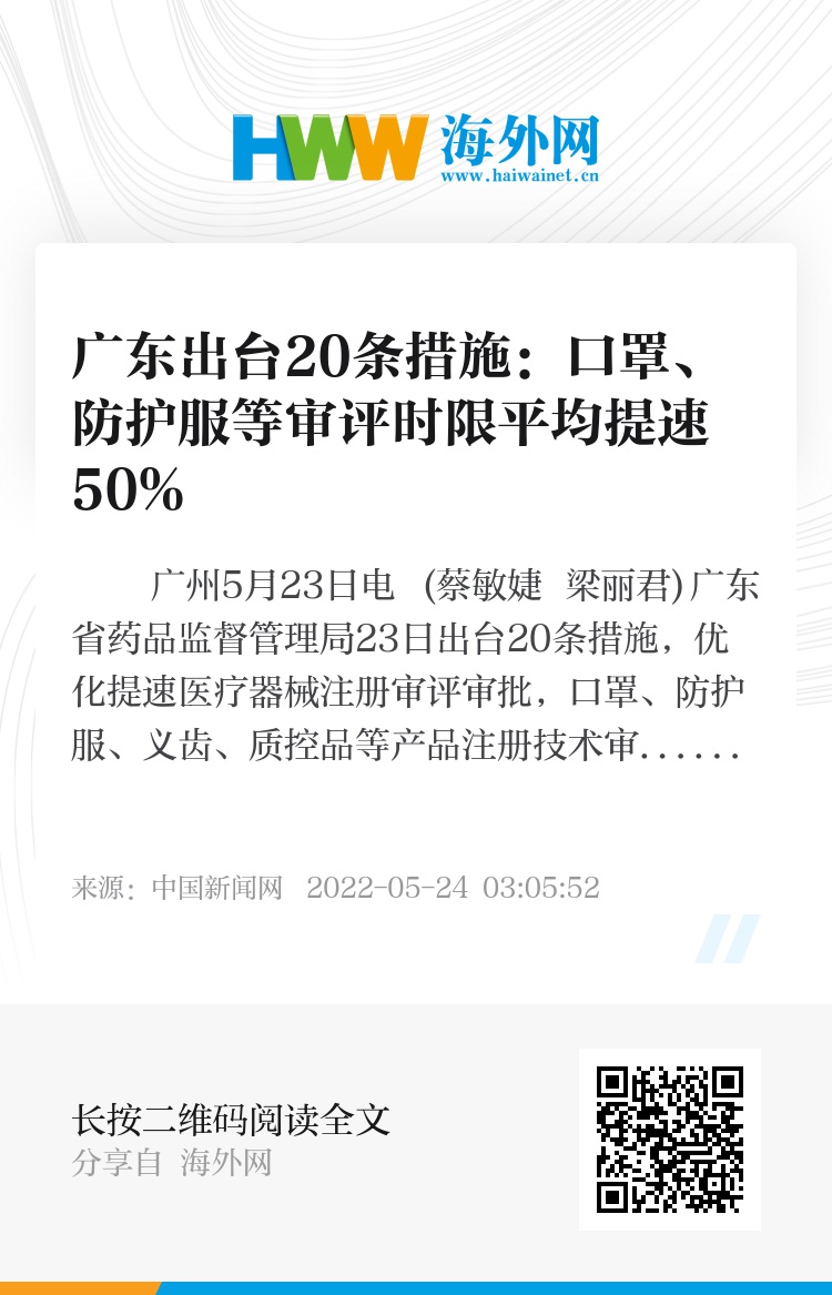 中新网广州5月23日电 (蔡敏婕 梁丽君)广东省药品监督管理局23日出台20条措施,优化提速医疗器械注册审评审批,口罩、防护服、义齿、质控品等产品注册技术审评时限比法定时限平均提速50%以上。