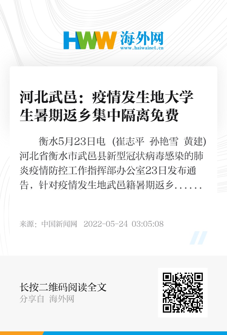 通告称,暑期将至,返乡大学生数量逐渐增加。为切实守护莘莘学子的生命健康安全,确保大家顺利、平安、健康返乡,考虑到大学生群体没有收入来源,本着自主自愿的原则,对疫情发生地武邑籍返乡大学生,凭学生证等有效证件,主动报备后可免费进行集中隔离。
