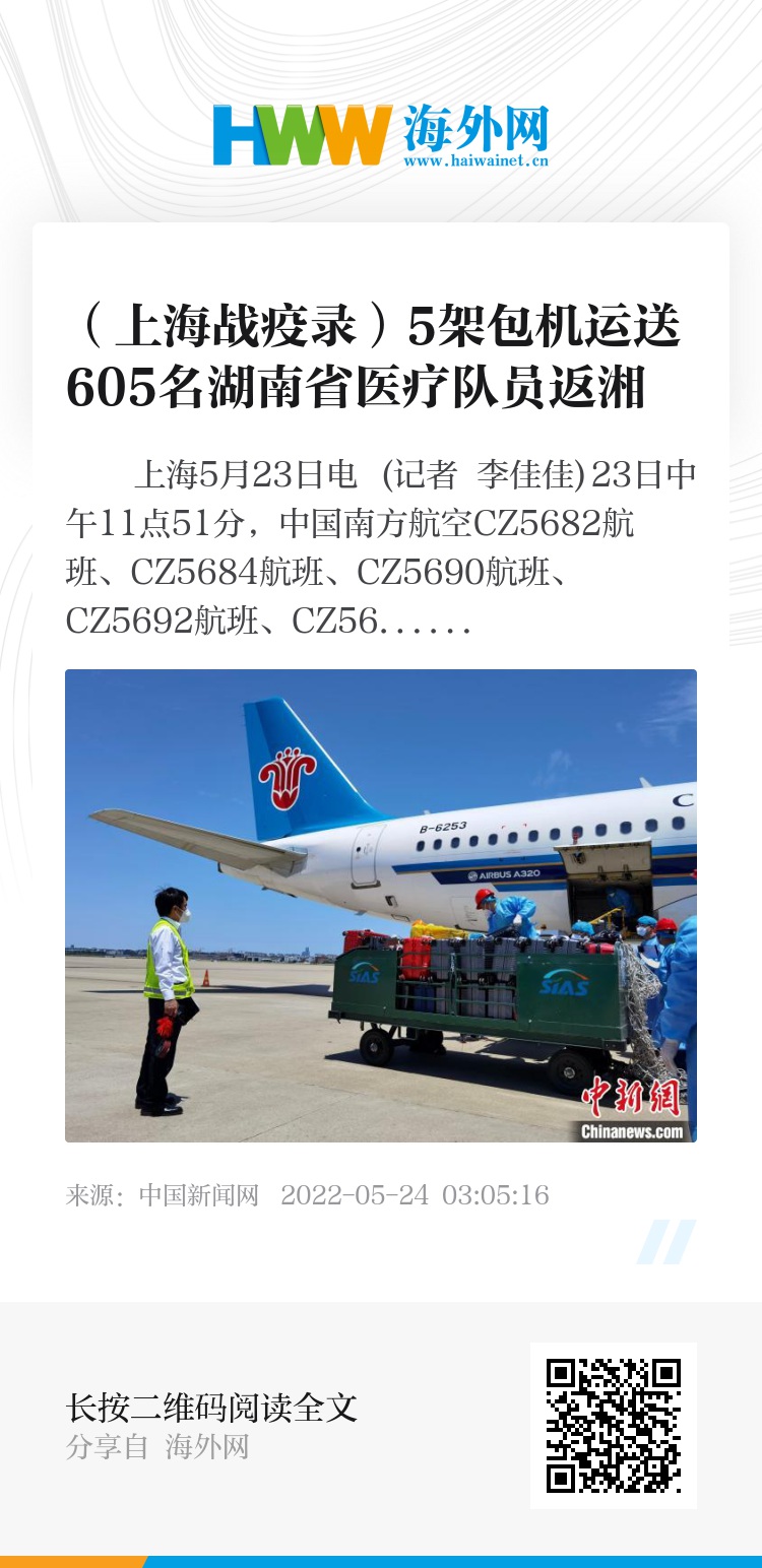 中新网上海5月23日电 (记者 李佳佳)23日中午11点51分,中国南方航空CZ5682航班、CZ5684航班、CZ5690航班、CZ5692航班、CZ5694航班相继从上海虹桥国际机场顺利起飞,护送605名湖南省援沪医疗队队员平安飞往湖南长沙黄花国际机场。