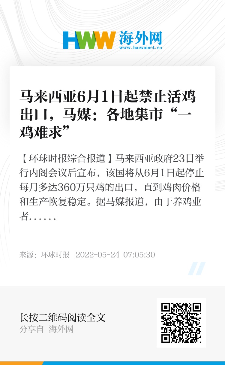 【环球时报综合报道】马来西亚政府23日举行内阁会议后宣布,该国将从6月1日起停止每月多达360万只鸡的出口,直到鸡肉价格和生产恢复稳定。据马媒报道,由于养鸡业者减产,上周末马来西亚全国各地集市普遍“一鸡难求”。