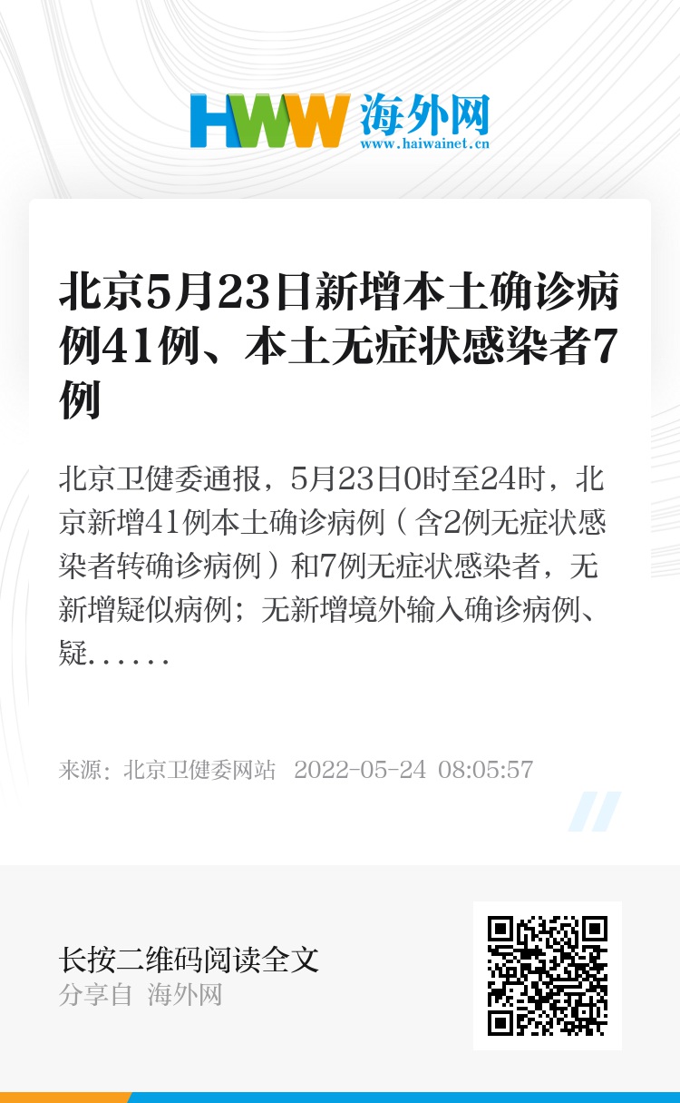 北京卫健委通报,5月23日0时至24时,北京新增41例本土确诊病例(含2例无症状感染者转确诊病例)和7例无症状感染者,无新增疑似病例;无新增境外输入确诊病例、疑似病例和无症状感染者。治愈出院39例。