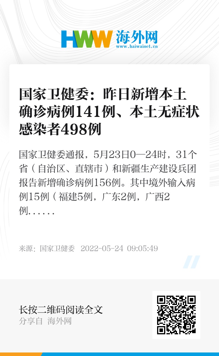 国家卫健委通报,5月23日0—24时,31个省(自治区、直辖市)和新疆生产建设兵团报告新增确诊病例156例。其中境外输入病例15例(福建5例,广东2例,广西2例,四川2例,江苏1例,浙江1例,重庆1例,云南1例),含1例由无症状感染者转为确诊病例(在浙江);本土病例141例(上海58例,北京41例,四川19例,天津16例,陕西4例,辽宁1例,吉林1例,浙江1例),含56例由无症状感染者转为确诊病例(上海39例,四川8例,天津6例,北京2例,辽宁1例)。新增死亡病例1例,为本土病例,在上海;新增疑似病例1例,为境外输入病例(在上海)。