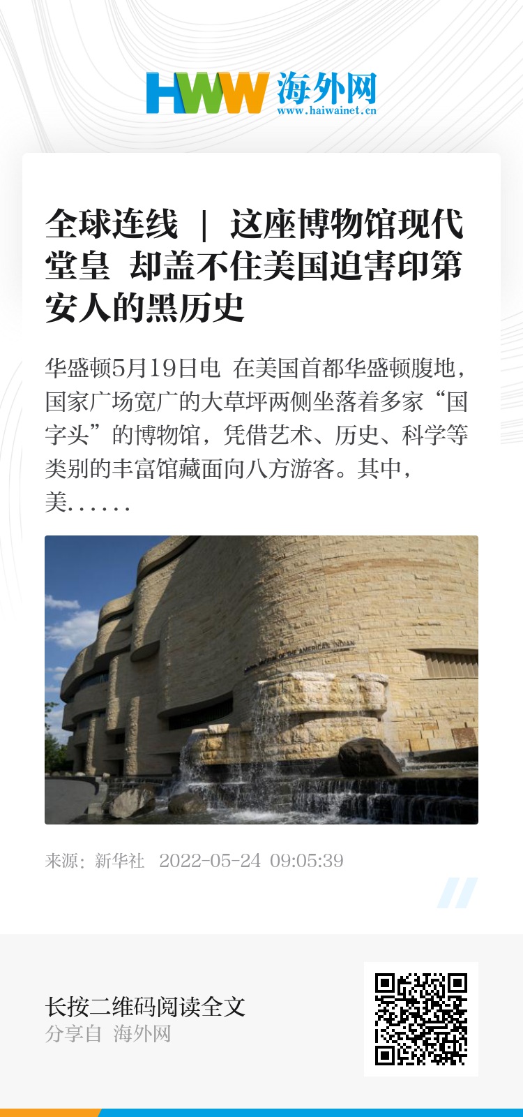 新华社华盛顿5月19日电 在美国首都华盛顿腹地,国家广场宽广的大草坪两侧坐落着多家“国字头”的博物馆,凭借艺术、历史、科学等类别的丰富馆藏面向八方游客。其中,美洲印第安人国家博物馆2004年才开放,算是这条“博物馆一条街”上的“后辈”。