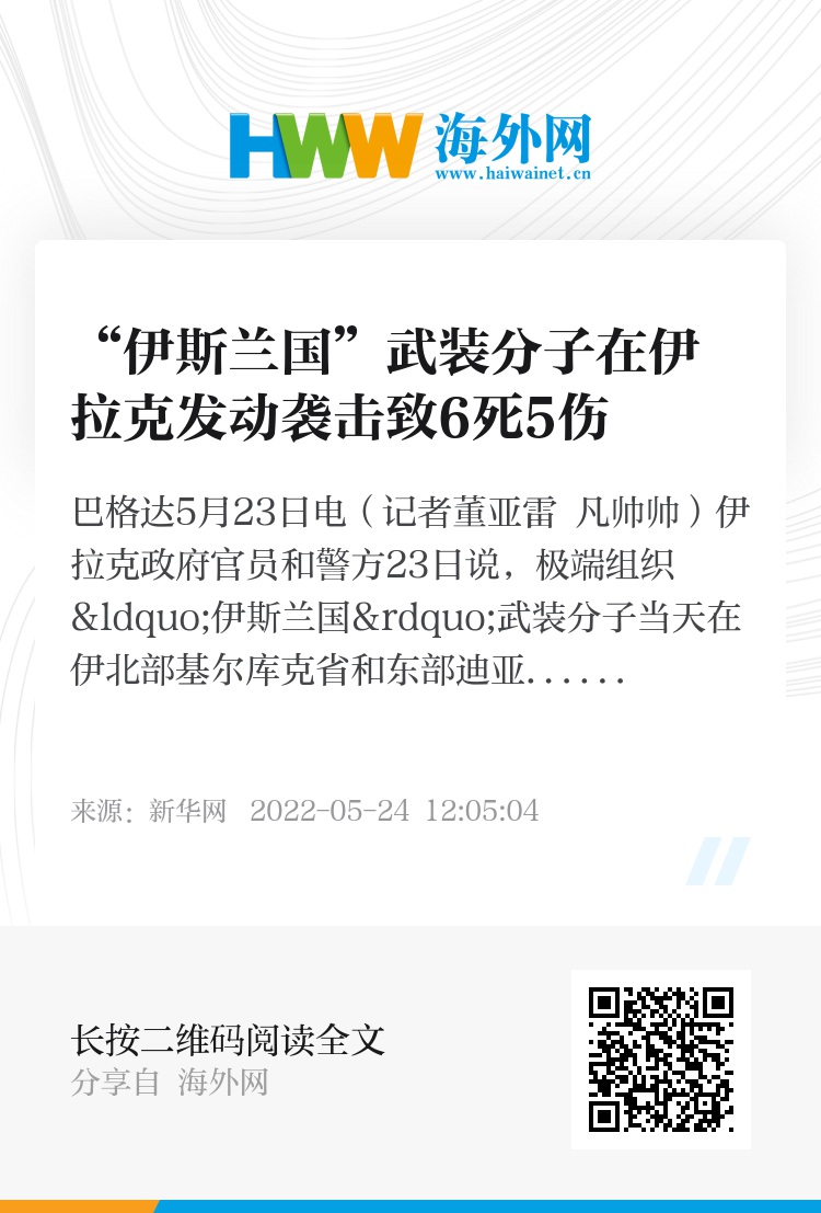 新华社巴格达5月23日电(记者董亚雷 凡帅帅)伊拉克政府官员和警方23日说,极端组织“伊斯兰国”武装分子当天在伊北部基尔库克省和东部迪亚拉省发动袭击,造成6人死亡、5人受伤。