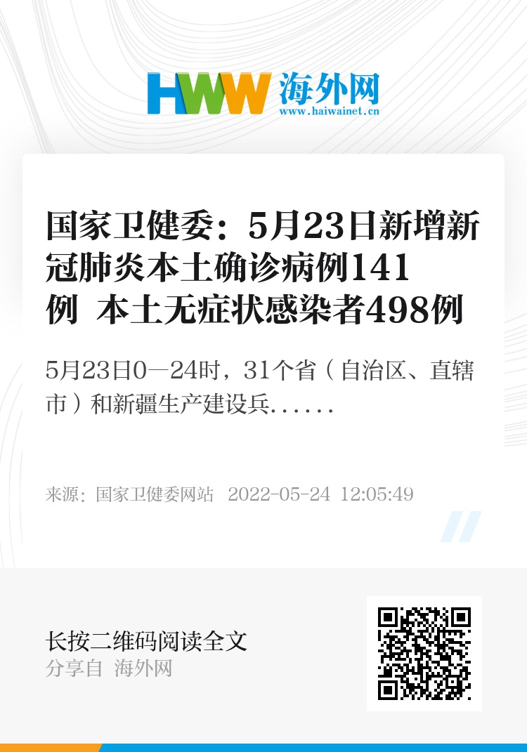 5月23日0―24时,31个省(自治区、直辖市)和新疆生产建设兵团报告新增确诊病例156例。其中境外输入病例15例(福建5例,广东2例,广西2例,四川2例,江苏1例,浙江1例,重庆1例,云南1例),含1例由无症状感染者转为确诊病例(在浙江);本土病例141例(上海58例,北京41例,四川19例,天津16例,陕西4例,辽宁1例,吉林1例,浙江1例),含56例由无症状感染者转为确诊病例(上海39例,四川8例,天津6例,北京2例,辽宁1例)。新增死亡病例1例,为本土病例,在上海;新增疑似病例1例,为境外输入病例(在上海)。