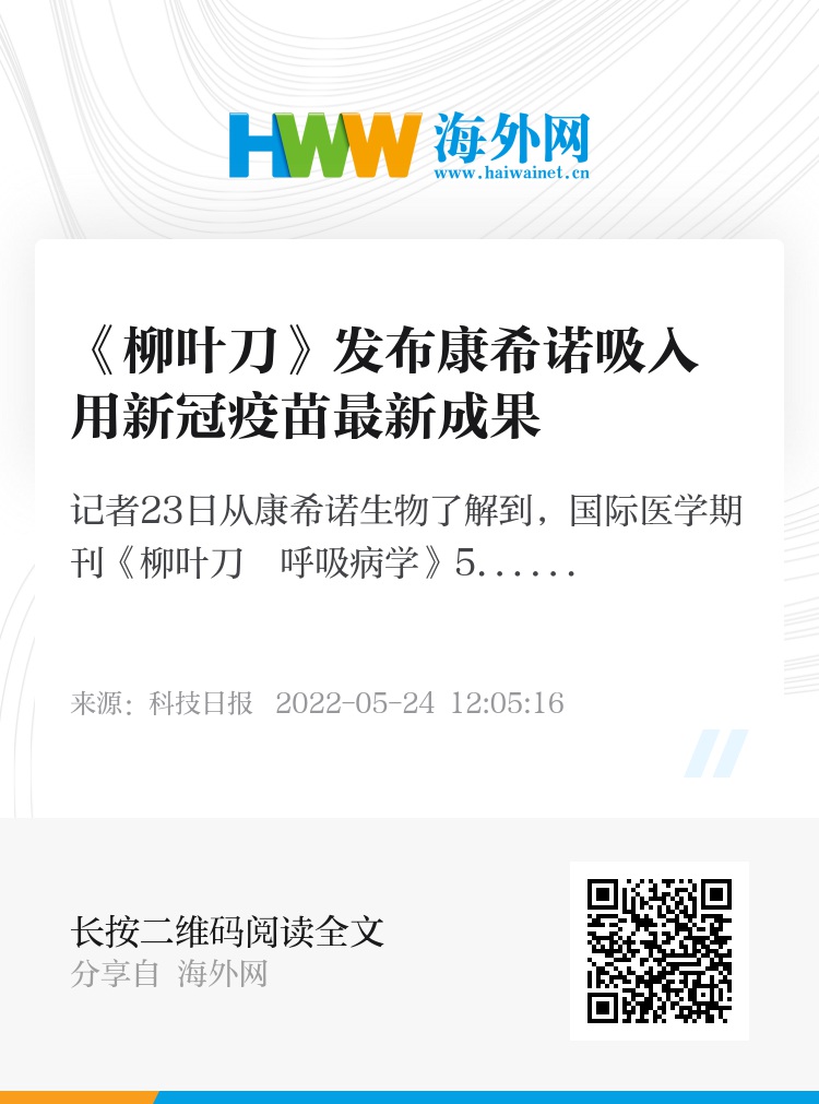 记者23日从康希诺生物了解到,国际医学期刊《柳叶刀・呼吸病学》5月20日发表了有关康希诺生物吸入用新冠疫苗的最新研究成果。通过对420名受试者的临床试验,序贯加强(俗称“混打”)康希诺吸入用新冠疫苗安全性良好,总不良反应发生率低于灭活疫苗同源加强,无严重不良反应发生,但可以比灭活疫苗同源加强诱导出更高水平的中和抗体水平,有望成为新冠疫苗加强接种的优先选择。这也是继5月19日世卫组织公布康希诺新冠疫苗被纳入“紧急使用清单”后,国产疫苗传来的又一振奋人心的消息。