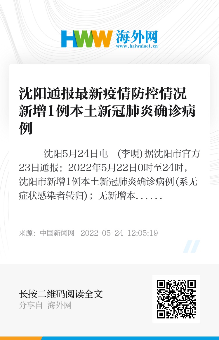 中新网沈阳5月24日电 (李晛)据沈阳市官方23日通报:2022年5月22日0时至24时,沈阳市新增1例本土新冠肺炎确诊病例(系无症状感染者转归);无新增本土新冠病毒无症状感染者。