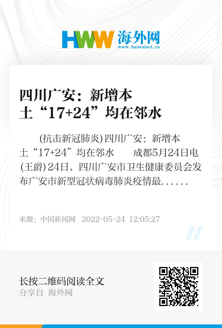 中新网成都5月24日电 (王爵)24日,四川广安市卫生健康委员会发布广安市新型冠状病毒肺炎疫情最新情况。5月23日0—24时,广安市报告新增本土确诊病例17例(均在邻水县),其中8例为既往无症状感染者转为确诊病例,9例为集中隔离管控人员中检测发现;新增本土无症状感染者24例(均在邻水县),均在集中隔离管控人员中检测发现。新增重症病例3例(其中2例为高龄、基础疾病多,未接种新冠病毒疫苗;1例基础疾病多,接种2剂次新冠病毒疫苗)。无新增境外输入确诊病例,无新增境外输入无症状感染者,无新增死亡病例。新增解除无症状感染者医学观察14例。