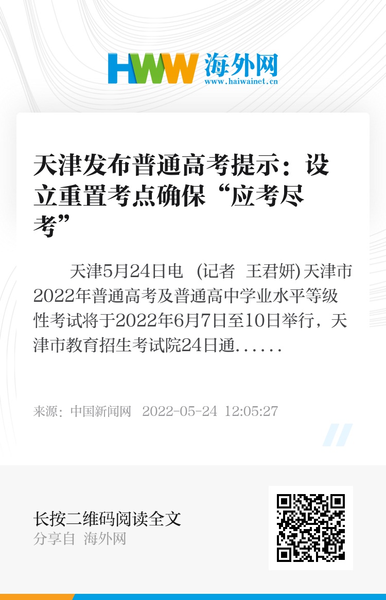 中新网天津5月24日电 (记者 王君妍)天津市2022年普通高考及普通高中学业水平等级性考试将于2022年6月7日至10日举行,天津市教育招生考试院24日通过微信公众号发布《天津市2022年普通高考考生疫情防控提示》。根据该提示,天津将设立常规考点(含常规考场和备用隔离考场)和重置考点(医院考点、隔离考点、独立考点),确保考生“应考尽考”。