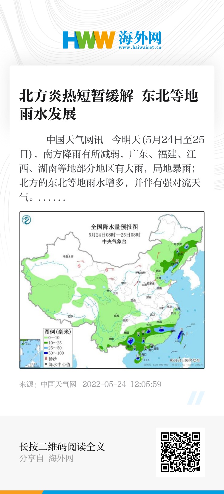 中国天气网讯 今明天(5月24日至25日),南方降雨有所减弱,广东、福建、江西、湖南等地部分地区有大雨,局地暴雨;北方的东北等地雨水增多,并伴有强对流天气。气温方面,未来三天,受冷空气和降雨影响,北方各地气温陆续下滑,炎热有所缓解。