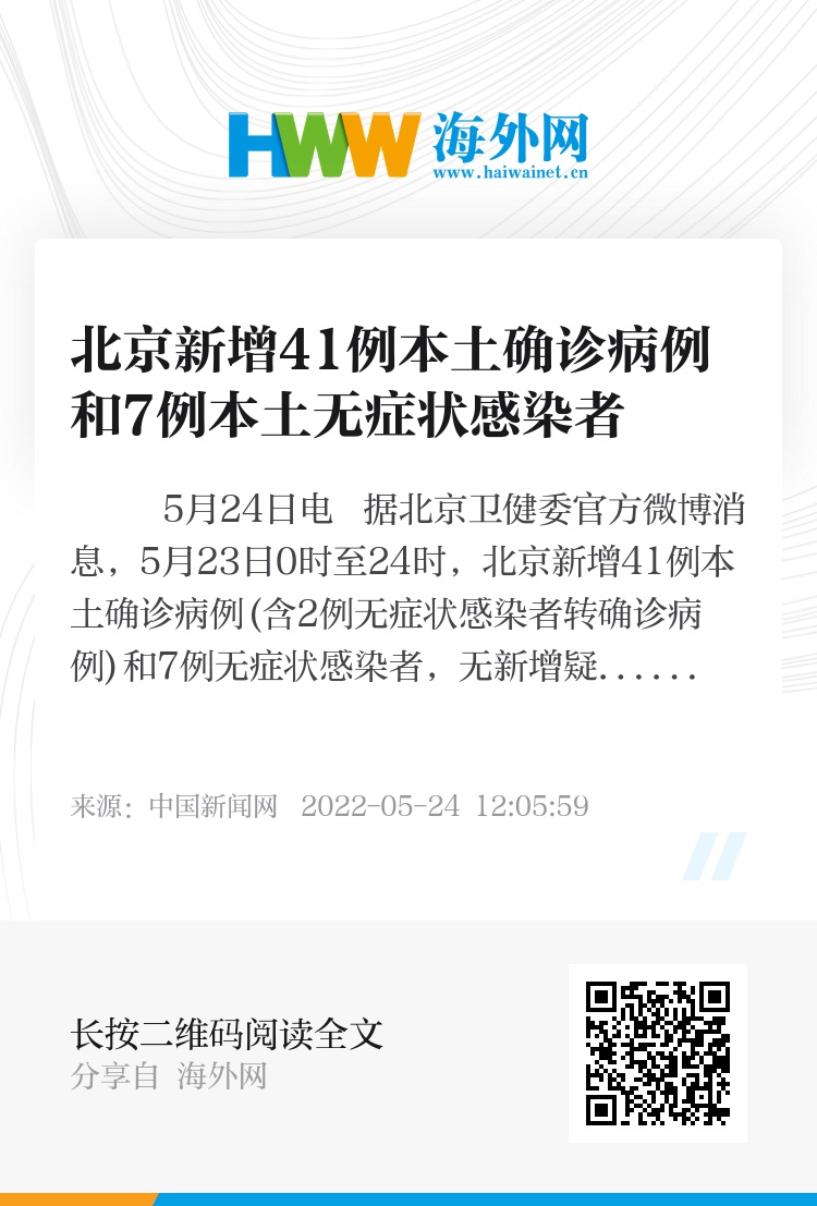 中新网5月24日电 据北京卫健委官方微博消息,5月23日0时至24时,北京新增41例本土确诊病例(含2例无症状感染者转确诊病例)和7例无症状感染者,无新增疑似病例;无新增境外输入确诊病例、疑似病例和无症状感染者。治愈出院39例。