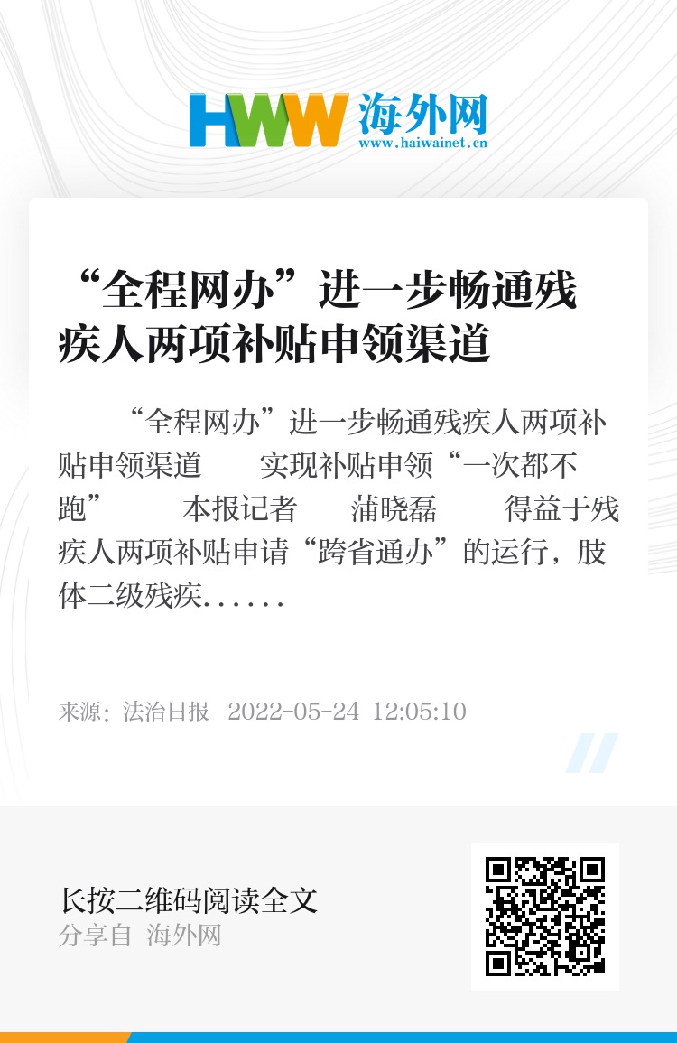 2021年4月22日起,困难残疾人生活补贴和重度残疾人护理补贴资格认定申请实行“跨省通办”,不受户籍地限制。在运行一年多之后,这一制度近日又迎来重要补充——民政部、中国残联联合印发通知,决定自2022年5月15日第三十二个“全国助残日”起,在“跨省通办”基础上,在全国范围内实行残疾人两项补贴申请“全程网办”服务。