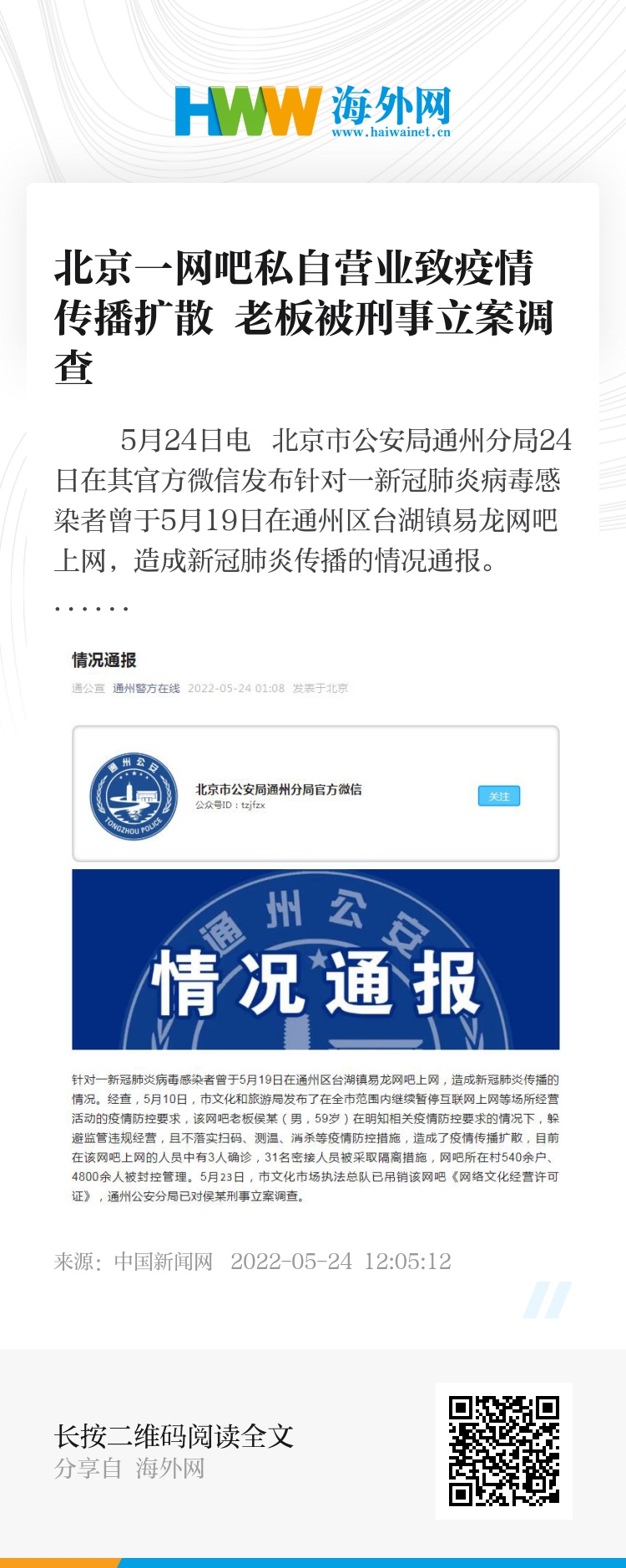 经查,5月10日,北京市文化和旅游局发布了在全市范围内继续暂停互联网上网等场所经营活动的疫情防控要求,该网吧老板侯某(男,59岁)在明知相关疫情防控要求的情况下,躲避监管违规经营,且不落实扫码、测温、消杀等疫情防控措施,造成了疫情传播扩散,目前在该网吧上网的人员中有3人确诊,31名密接人员被采取隔离措施,网吧所在村540余户、4800余人被封控管理。5月23日,北京市文化市场执法总队已吊销该网吧《网络文化经营许可证》,通州公安分局已对侯某刑事立案调查。