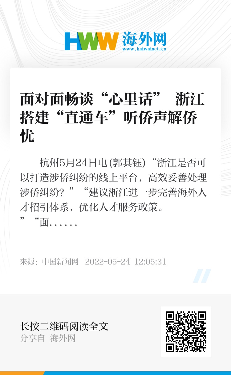中新网杭州5月24日电(郭其钰)“浙江是否可以打造涉侨纠纷的线上平台,高效妥善处理涉侨纠纷?”“建议浙江进一步完善海外人才招引体系,优化人才服务政策。”“面对逐年增加的回流华侨生,建议浙江因地施策,让华文教育不出国也能国际化”……