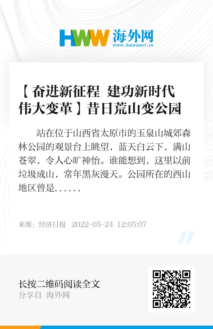 站在位于山西省太原市的玉泉山城郊森林公园的观景台上眺望,蓝天白云下,满山苍翠,令人心旷神怡。谁能想到,这里以前垃圾成山,常年黑灰漫天。公园所在的西山地区曾是太原污染重灾区,峰值时期污染企业聚集,环境破坏严重。