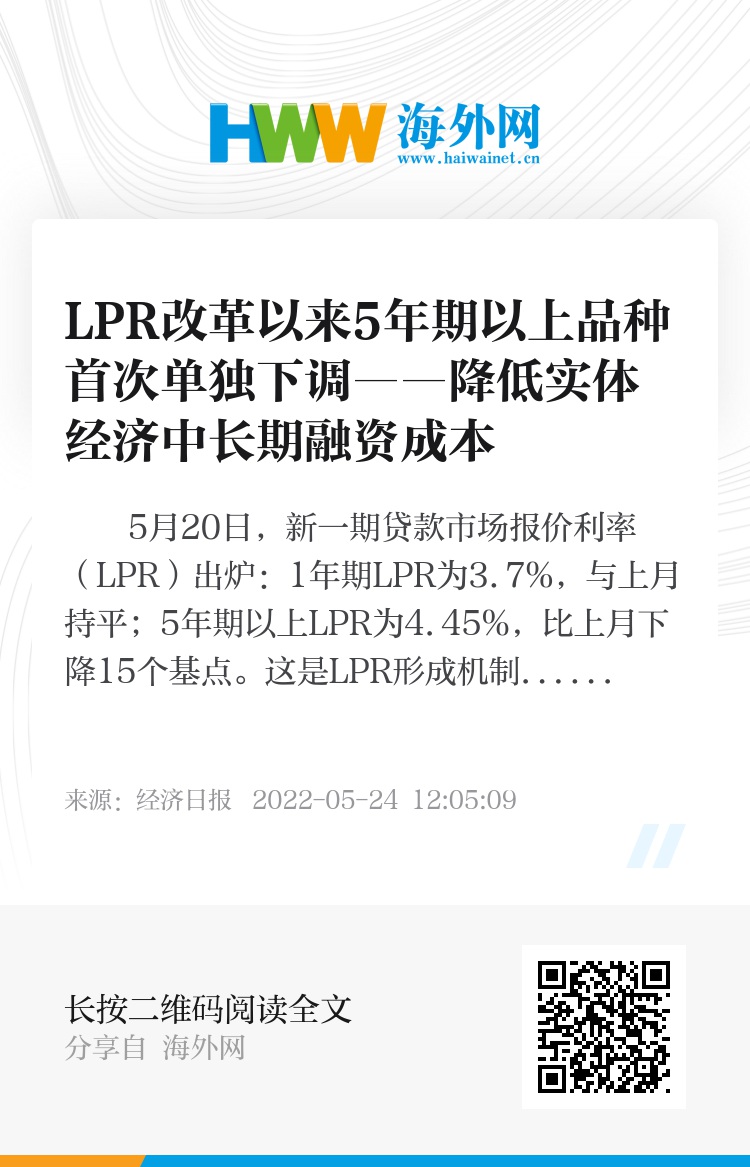 5月20日,新一期贷款市场报价利率(LPR)出炉:1年期LPR为3.7%,与上月持平;5年期以上LPR为4.45%,比上月下降15个基点。这是LPR形成机制改革以来,首次出现1年期LPR不降、5年期以上LPR下降,而且创下最大降幅纪录。业内专家认为,这种结构性降息体现了在当前稳增长的关键时期,金融加大力度为实体经济纾困,提振有效需求,稳定经济增速。