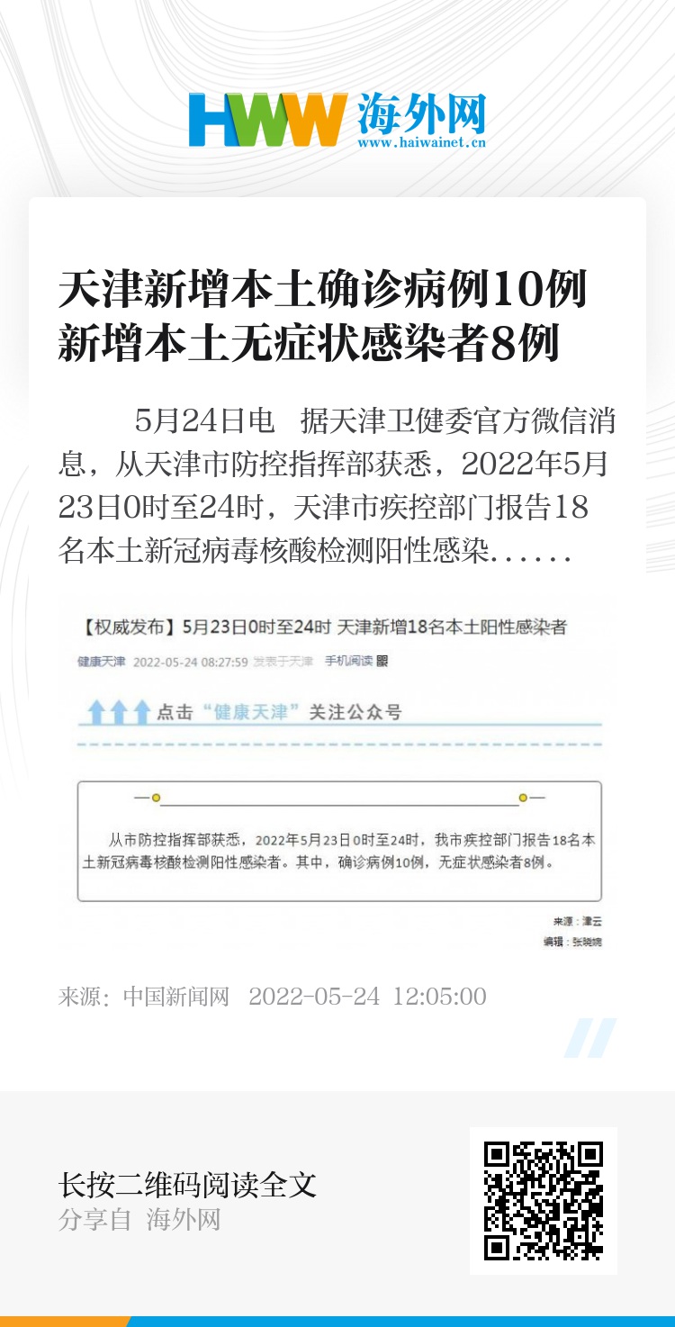 中新网5月24日电 据天津卫健委官方微信消息,从天津市防控指挥部获悉,2022年5月23日0时至24时,天津市疾控部门报告18名本土新冠病毒核酸检测阳性感染者。其中,确诊病例10例,无症状感染者8例。