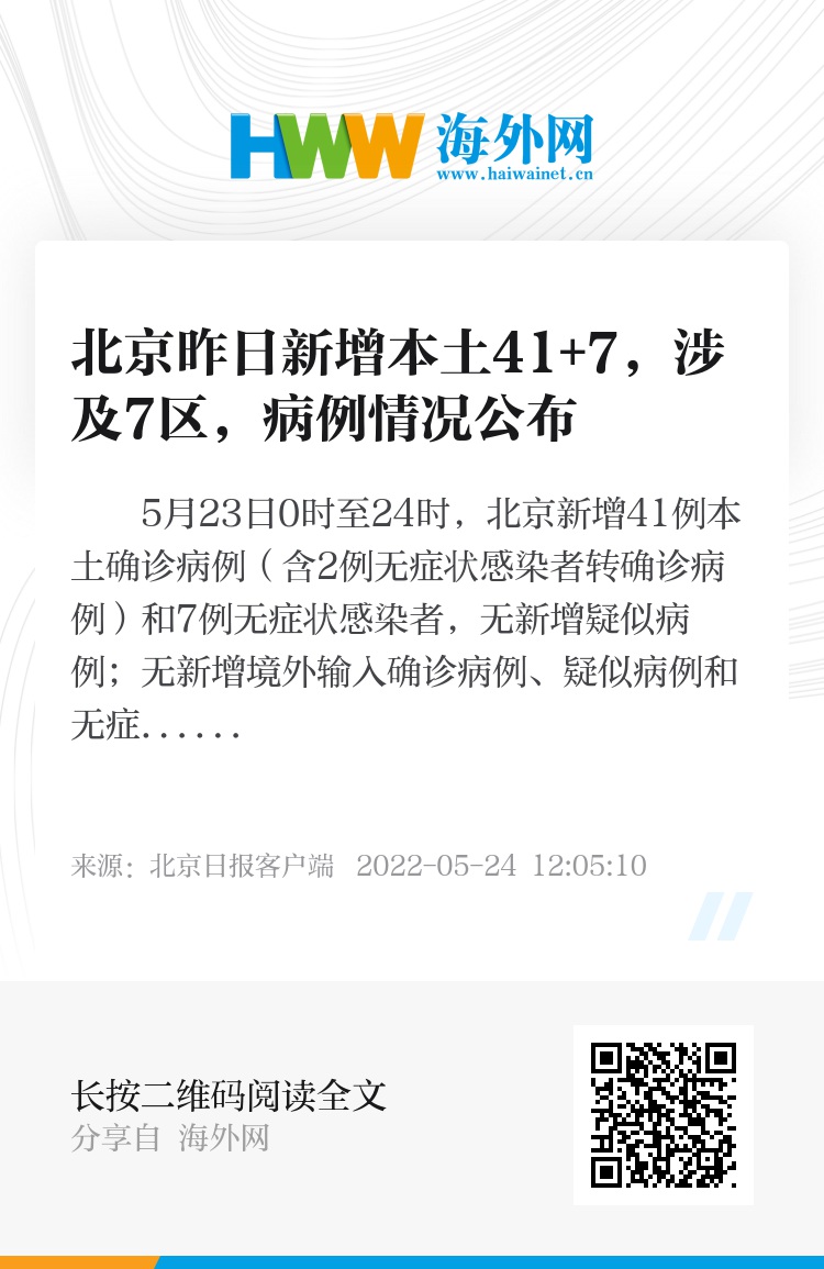 5月23日0时至24时,北京新增41例本土确诊病例(含2例无症状感染者转确诊病例)和7例无症状感染者,无新增疑似病例;无新增境外输入确诊病例、疑似病例和无症状感染者。治愈出院39例。