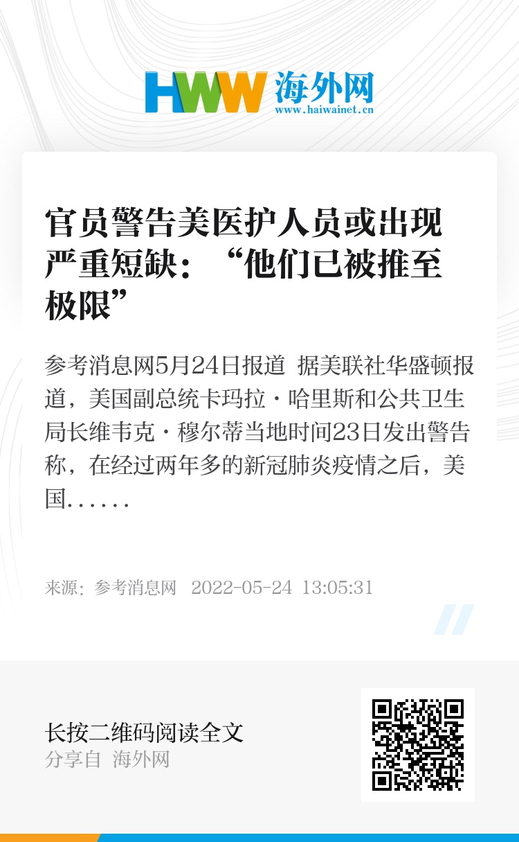 参考消息网5月24日报道 据美联社华盛顿报道,美国副总统卡玛拉·哈里斯和公共卫生局长维韦克·穆尔蒂当地时间23日发出警告称,在经过两年多的新冠肺炎疫情之后,美国的医护人员可能出现职业倦怠,包括未来几年可能出现严重的人员不足。
