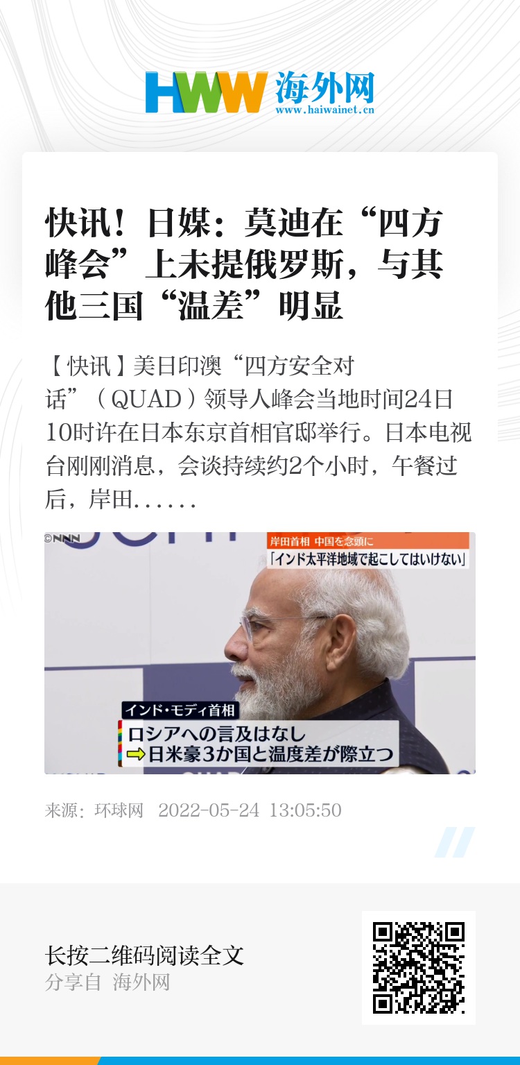 日本电视台报道称,印度与俄罗斯保持友好关系,印度总理莫迪未在会议上谈及俄罗斯,在对俄态度方面与其他三个参会国家“温差”明显。该媒体援引匿名日本外务省高级官员的话声称,“在这种情况下,重要的是如何在对抗中国方面上进行合作”。