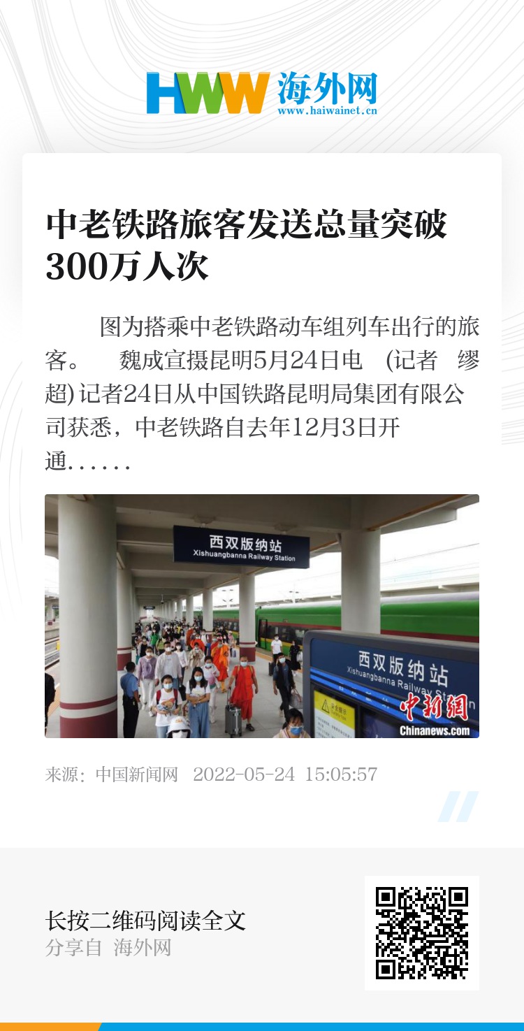 中新网昆明5月24日电 (记者 缪超)记者24日从中国铁路昆明局集团有限公司获悉,中老铁路自去年12月3日开通以来至今年5月23日,旅客发送总量达到309万人次。其中,中国段271万人次,老挝段38万人次。