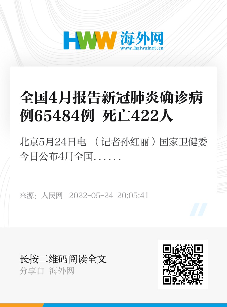 人民网北京5月24日电 (记者孙红丽)国家卫健委今日公布4月全国法定传染病疫情概况。4月,全国(不含香港、澳门特别行政区和台湾地区)共报告法定传染病481403例,死亡2200人。全国报告新型冠状病毒肺炎确诊病例65484例,死亡422人。