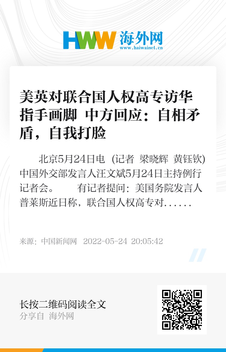 汪文斌:一段时间以来,围绕联合国人权高专访华,美、英等西方国家上演了一出又一出政治闹剧。他们先是公开施压,强烈要求高专访华并访疆,进行有罪推定式的所谓“调查”。在中方同高专办通过平等协商,确定高专访华安排后,美、英等国又跳出来不遗余力地干扰破坏,对高专访问指手画脚,为访问设立种种条件和障碍。真是翻手为云,覆手为雨,自相矛盾,自我打脸。他们关心的到底是人权,还是把人权问题政治化、武器化、工具化?