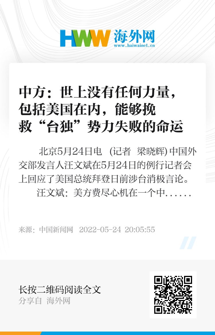 中新网北京5月24日电 (记者 梁晓辉)中国外交部发言人汪文斌在5月24日的例行记者会上回应了美国总统拜登日前涉台消极言论。
