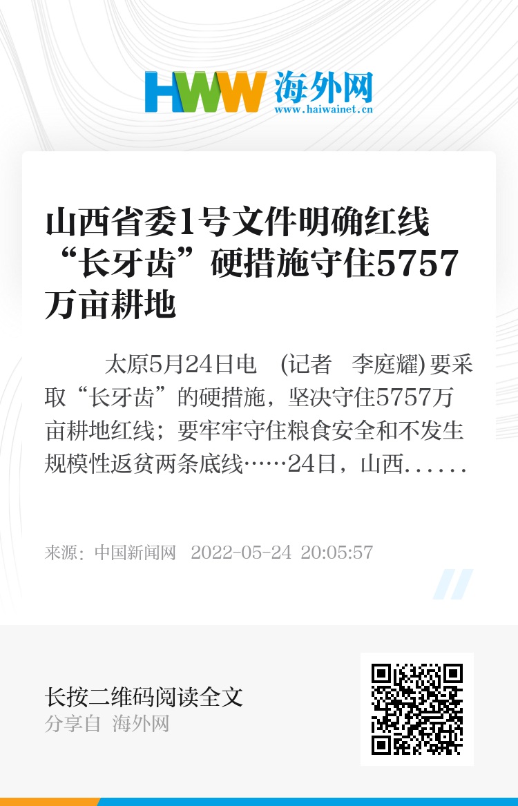 中新网太原5月24日电 (记者 李庭耀)要采取“长牙齿”的硬措施,坚决守住5757万亩耕地红线;要牢牢守住粮食安全和不发生规模性返贫两条底线……24日,山西省政府新闻办举行发布会,解读中共山西省委、山西省政府发布的《关于做好2022年全面推进乡村振兴重点工作的实施意见》(简称《意见》),即2022年山西省委1号文件。