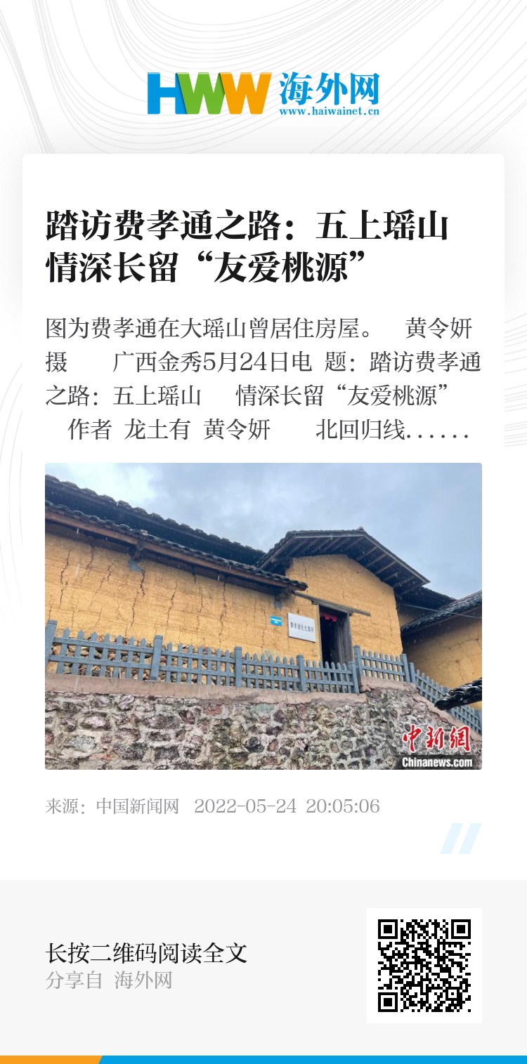 中新网广西金秀5月24日电 题:踏访费孝通之路:五上瑶山 情深长留“友爱桃源”