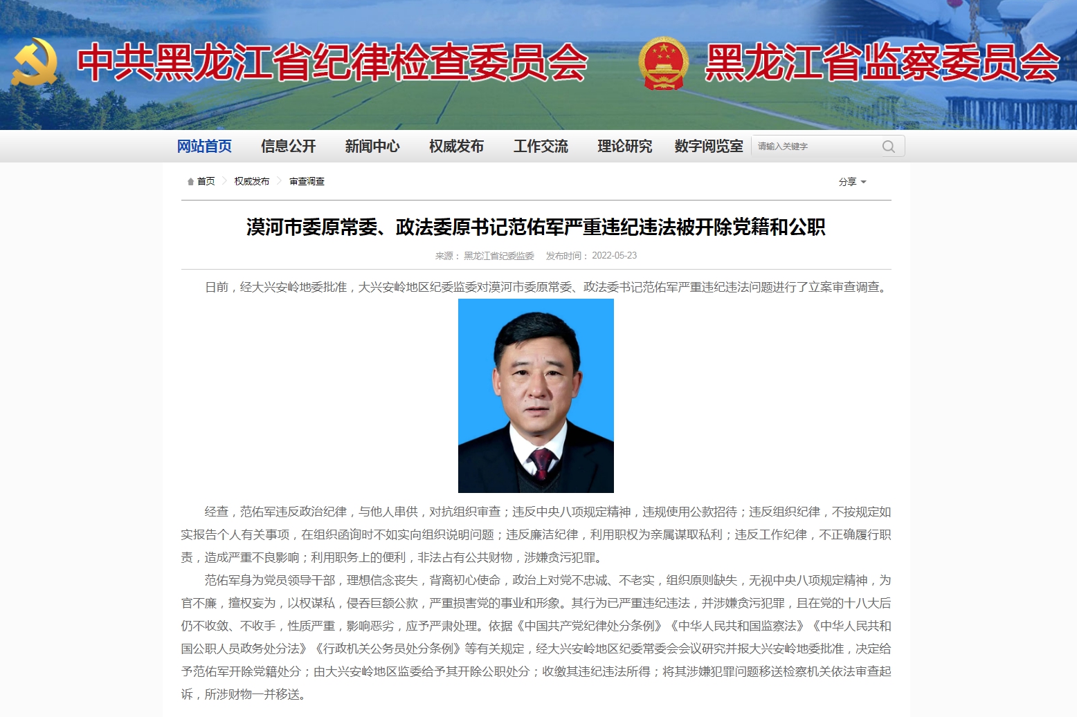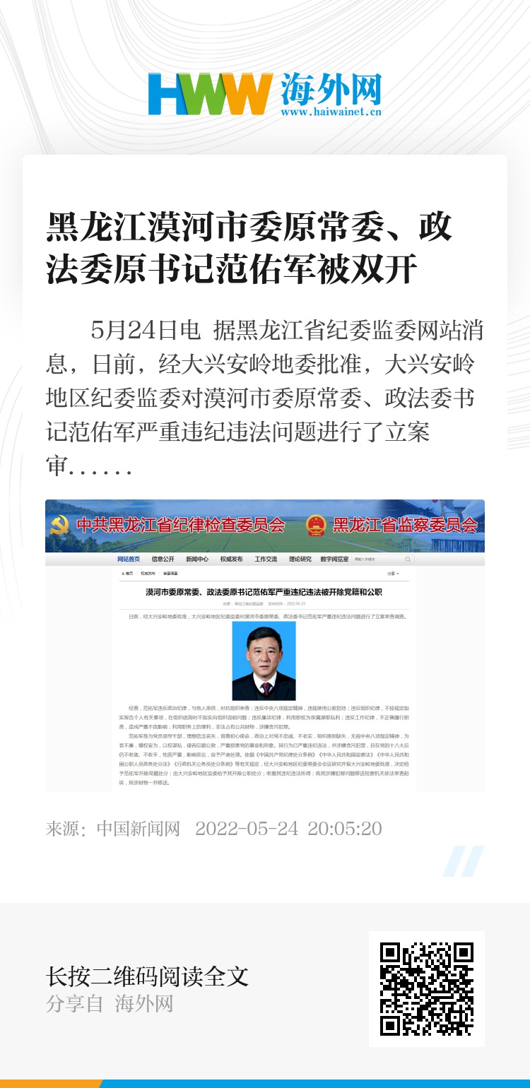 中新网5月24日电 据黑龙江省纪委监委网站消息,日前,经大兴安岭地委批准,大兴安岭地区纪委监委对漠河市委原常委、政法委书记范佑军严重违纪违法问题进行了立案审查调查。