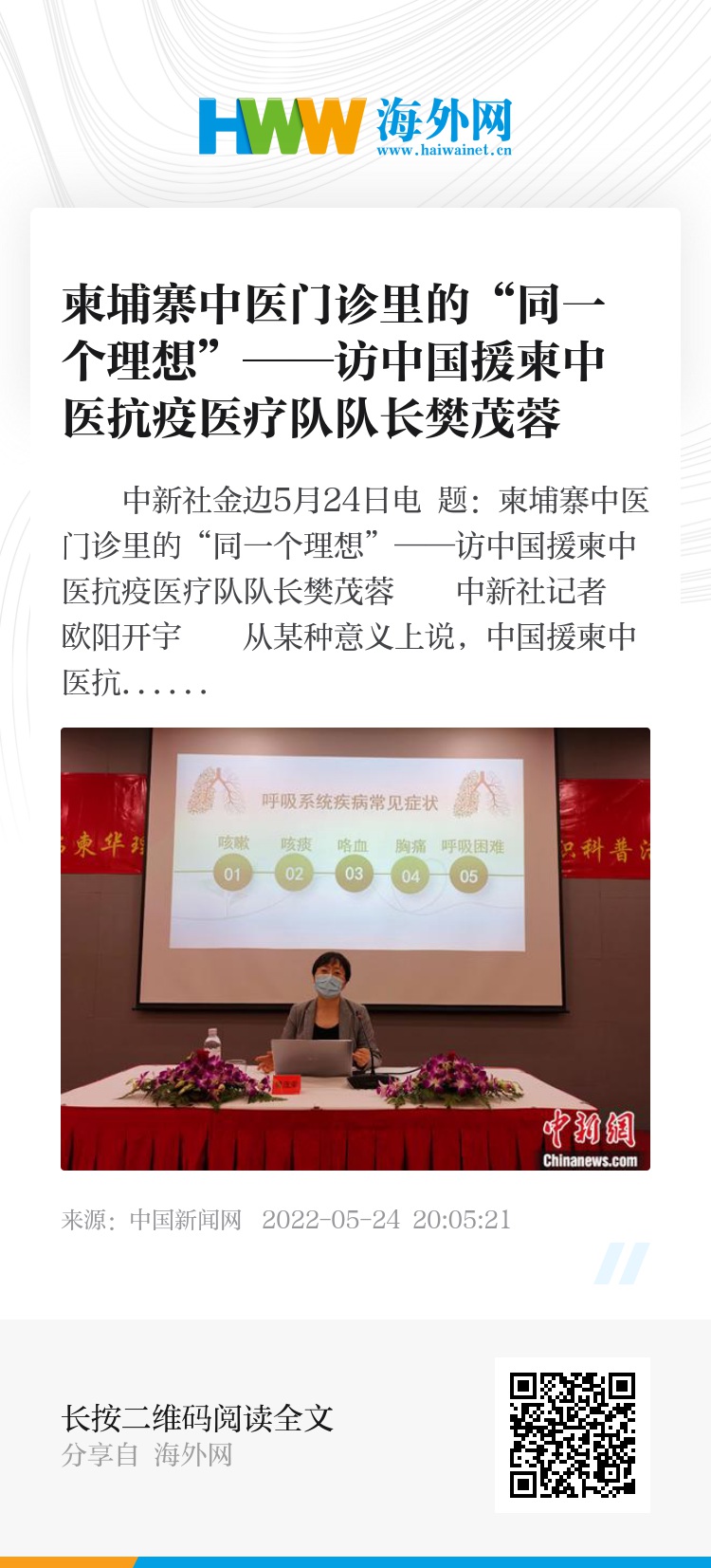 中新社金边5月24日电 题:柬埔寨中医门诊里的“同一个理想”——访中国援柬中医抗疫医疗队队长樊茂蓉