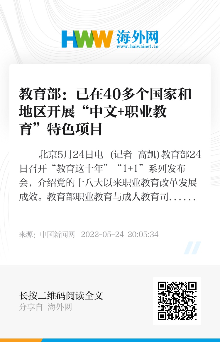 中新网北京5月24日电 (记者 高凯)教育部24日召开“教育这十年”“1+1”系列发布会,介绍党的十八大以来职业教育改革发展成效。教育部职业教育与成人教育司司长陈子季介绍,十年来,我国职业教育在“引进来”和“走出去”中不断实现“再提升”,在40多个国家和地区开设“中文+职业教育”特色项目。