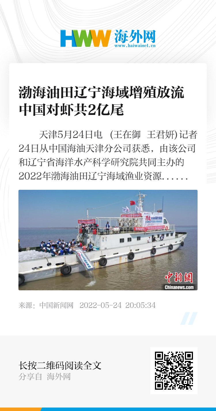 中新网天津5月24日电 (王在御 王君妍)记者24日从中国海油天津分公司获悉,由该公司和辽宁省海洋水产科学研究院共同主办的2022年渤海油田辽宁海域渔业资源增殖放流活动日前成功举办。据统计,本次活动自5月13至18日累计共投放中国对虾苗种2亿尾。放流苗种经现场抽样、称重、测量、计数、验收合格后、经船舶放归入海。